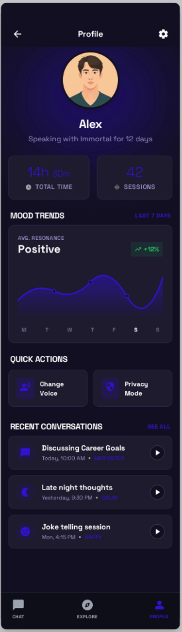 Mood Trend Analytics: Built a tracking dashboard for "Average Resonance" to monitor the user's emotional state over time, allowing for a proactive rather than reactive companion experience.