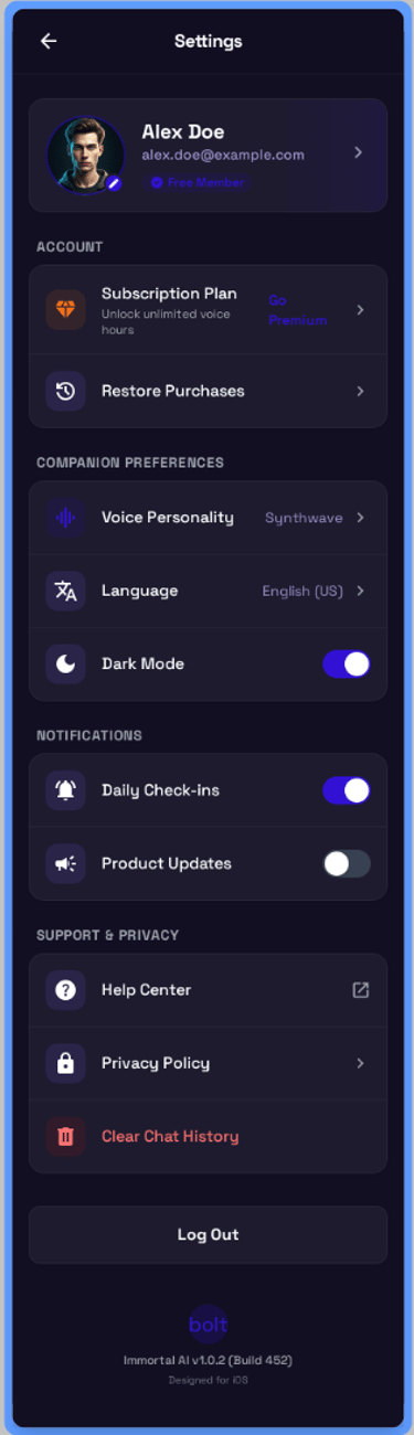 Safety & Privacy Architecture: Recognizing the sensitivity of voice data, I prioritized a "Privacy Mode" and clear "Dark Mode" settings to ensure the product feels safe for vulnerable users.