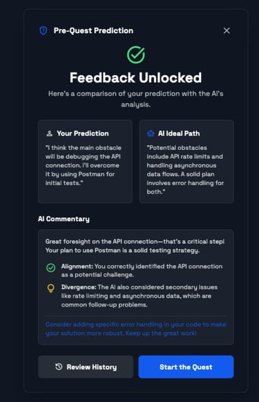 Pre-task Prediction: Instead of jumping straight to AI, students must forecast roadblocks, forcing critical thinking before execution.