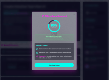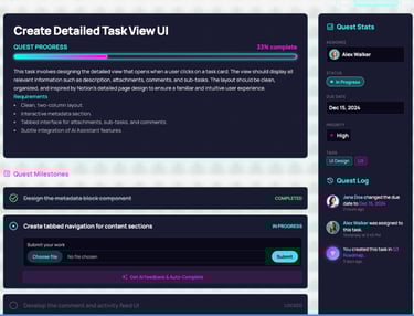 Gamified Task Detail (Quest Logic): Tasks are reframed as "Quests" with gated milestones and quizzes to ensure students "do" the work rather than just "generate" it.
